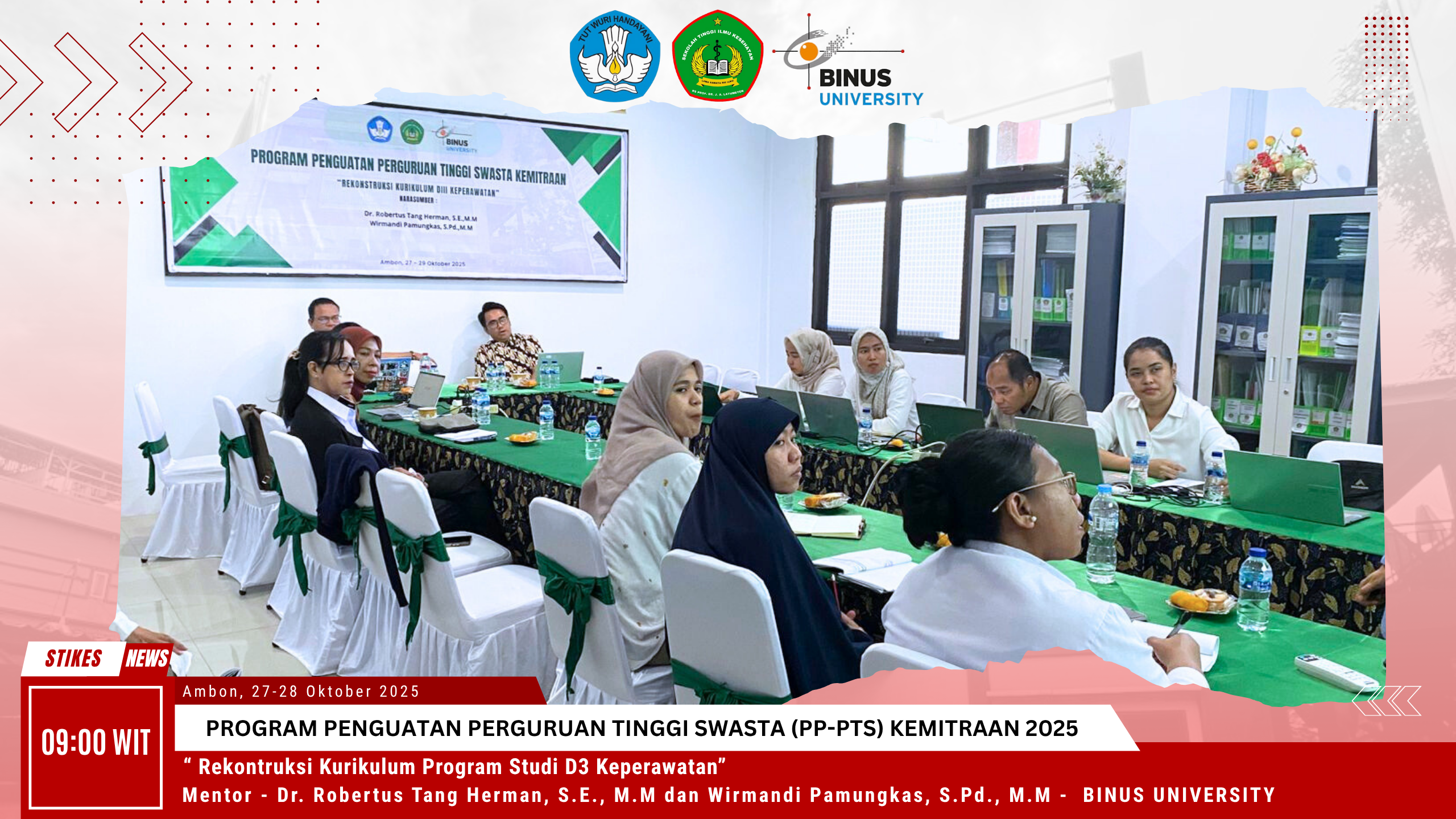 Ambon, 27-28 November 2025 — Sekolah Tinggi Ilmu Kesehatan (STIKes) RS Prof. Dr. J. A. Latumeten melaksanakan kegiatan Pendampingan Rekonstruksi Kurikulum untuk Program Studi D3 Keperawatan. Kegiatan ini diselenggarakan sebagai bagian bagian dari Program Penguatan Perguruan Tinggi Swasta (PTS) Kemitraan Tahun 2025 dalam upaya penguatan mutu pendidikan dan penyesuaian kurikulum terhadap kebutuhan dunia kerja serta perkembangan kebijakan nasional di bidang pendidikan tinggi kesehatan.