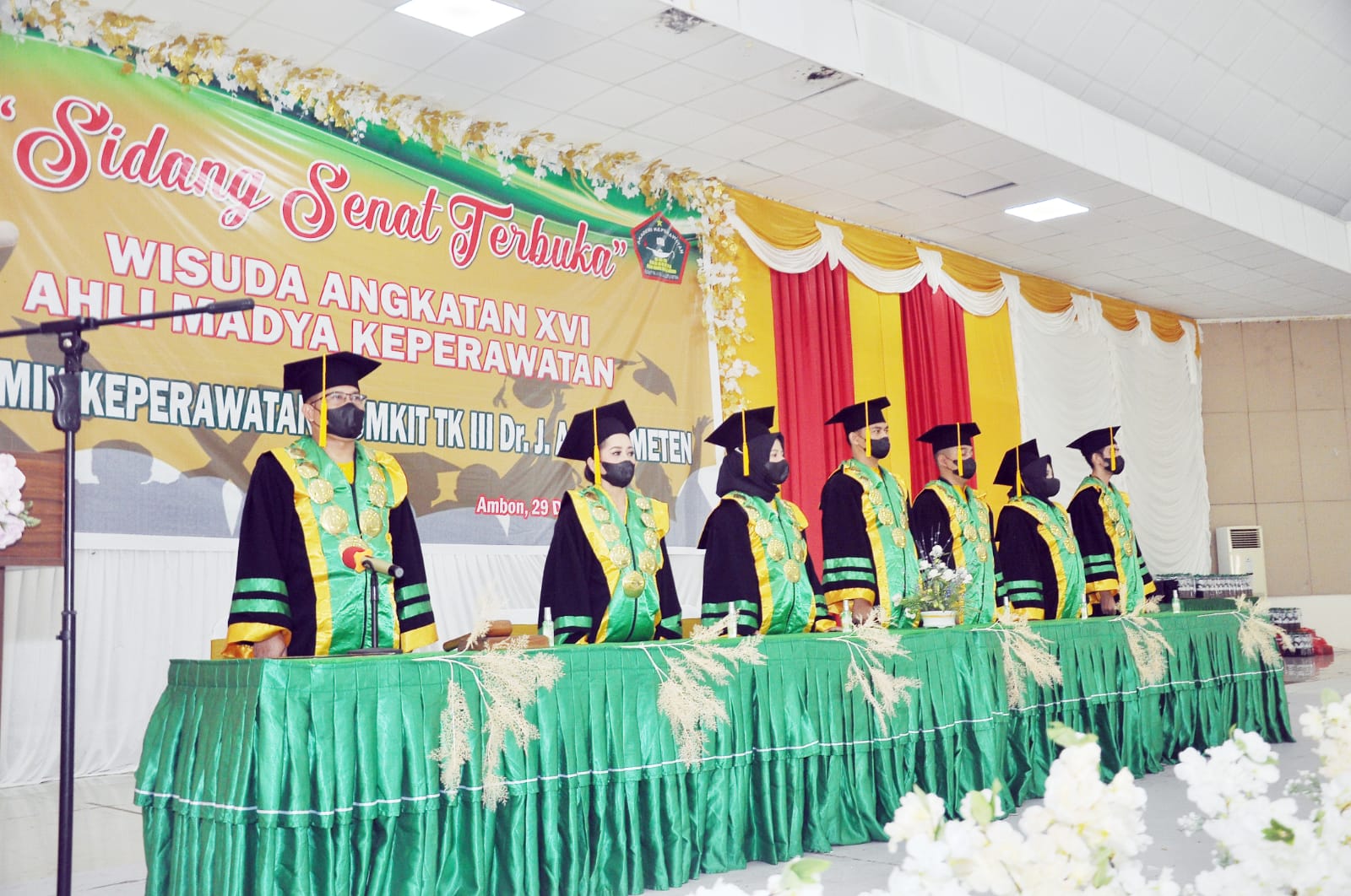 Ambon 105 mahasiswa Akademik Keperawatan Rumkit TK III Dr. J. A Latumeten diwisudakan, Rabu (29/12/2021) pagi. Prosesi Sidang Senat Terbuka wisuda angkatan ke-16 Ahli Madya Keperawatan ini dilangsungkan di gedung Islamic Center, Jalan Waihaong Pante, Silale, Nusaniwe, Kota Ambon. Acara dimulai dengan penyambutan calon wisudawan dan wisudawati ke dalam gedung Islamic Center diiringi lagu tradisional Maluku berjudul 'Hio-hio'.